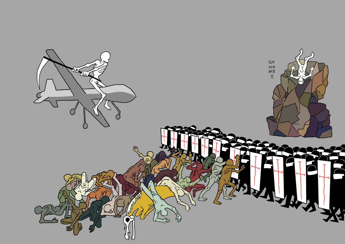 Satirical pastiche of Pieter Bruegel the Elder's triumph of death.