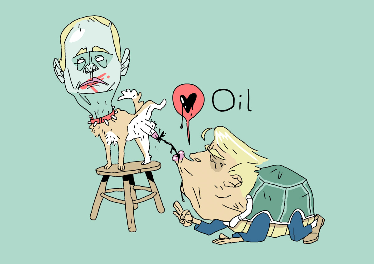 Satirical drawing of Putin and Trump.